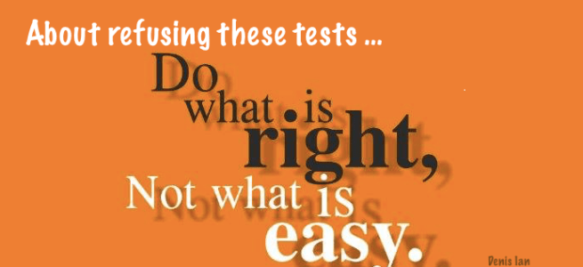 About refusing these tests ... a mom writes ... "Although I am 100% against it, and I have made my feelings clearly known to my husband, my son specifically asked that he be allowed to [take the] test … and my husband feels like we should allow him to do it. I am beyond frustrated … Continue reading Helping Your Children Refuse